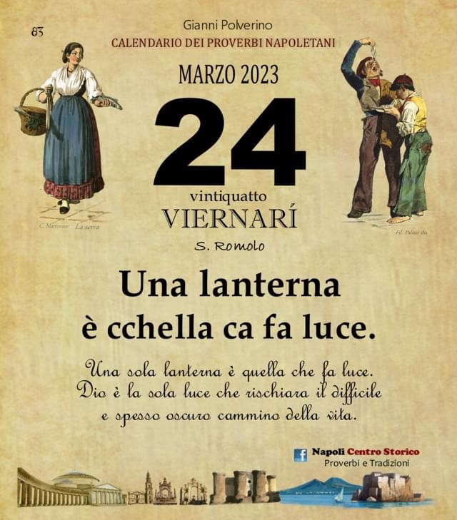 ‘O PRUVERBIO D’ ‘O JUORNO. Venerdì 24 marzo 2023 24/03/2023 binews.it ATTUALITA', EVIDENZA, Il Proverbio del Giorno 0 di Gianni Polverino Una lanterna è cchella ca fa luce. Una sola lanterna è quella che fa luce. Dio è la sola luce che rischiara il difficile e spesso oscuro cammino della vita.