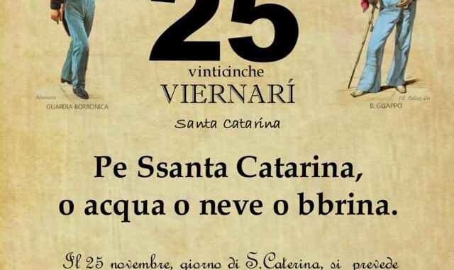 ‘O PRUVERBIO D’ ‘O JUORNO. Venerdì 25 novembre 2022 25/11/2022 binews.it ATTUALITA', EVIDENZA, Il Proverbio del Giorno 0 di Gianni PolverinoPe Ssanta Catarina, o acqua o neve o bbrina. Il 25 novembre, giorno di S. Caterina, si prevede o pioggia o neve o brina.