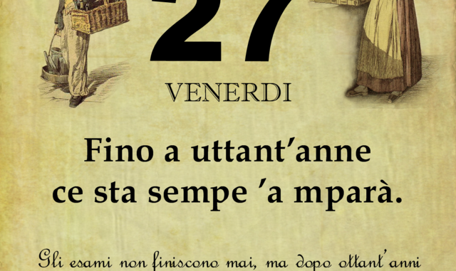 ‘O PRUVERBIO D’ ‘O JUORNO. Venerdì 27 aprile 2018 27/04/2018 binews.it ATTUALITA', Il Proverbio del Giorno 0 di Gianni Polverino Fino a uttant’anne ce sta sempe ’a mparà. Gli esami non finiscono mai, ma dopo ottant’anni la memoria e le funzioni mentali vengono meno.0