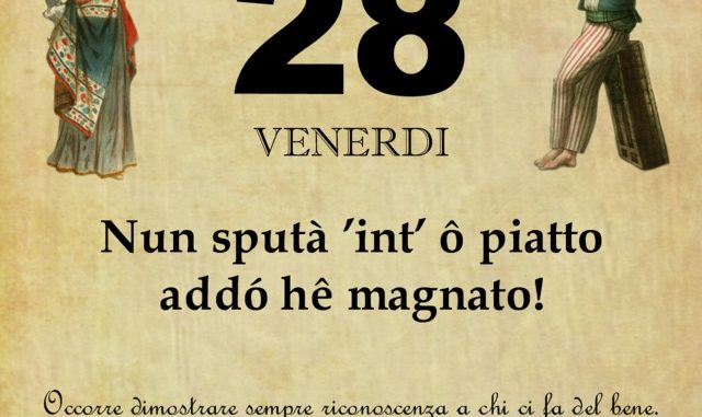 ‘O PRUVERBIO D’ ‘O JUORNO. Venerdì 28 febbraio 2020 28/02/2020 binews.it ATTUALITA', EVIDENZA, Il Proverbio del Giorno 0 di Gianni Polverino Nun sputà ’int’ ô piatto addó hê magnato! Occorre dimostrare sempre riconoscenza a chi ci fa del bene.