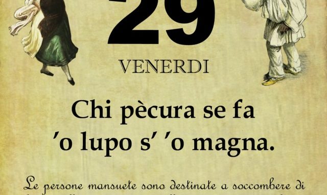 ‘O PRUVERBIO D’ ‘O JUORNO. Venerdì 29 marzo 2019 29/03/2019 binews.it ATTUALITA', EVIDENZA, Il Proverbio del Giorno 0 di Gianni Polverino Chi pècura se fa ’o lupo s’ ’o magna. Le persone mansuete sono destinate a soccombere di fronte alle prepotenze ed alle cattiverie dei più forti.