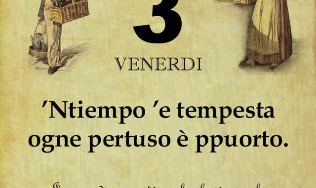‘O PRUVERBIO D’ ‘O JUORNO. Venerdì 3 agosto 2018 03/08/2018 binews.it ATTUALITA', Il Proverbio del Giorno 0 di Gianni Polverino ’Ntiempo ’e tempesta ogne pertuso è ppuorto. In caso di necessità anche il più piccolo aiuto può rivestire una grande importanza.