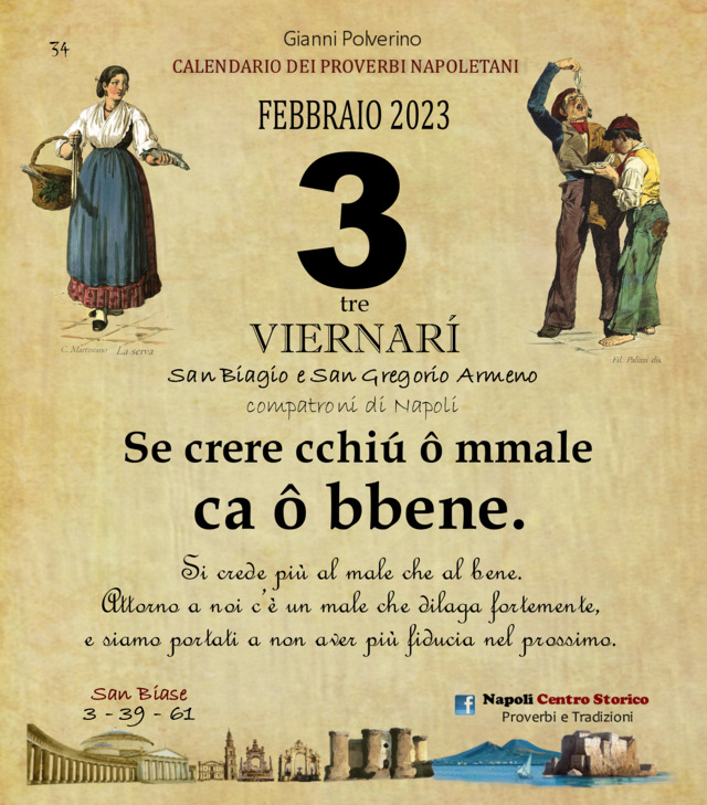 ‘O PRUVERBIO D’ ‘O JUORNO. Venerdì 3 febbraio 2023 03/02/2023 binews.it ATTUALITA', EVIDENZA, Il Proverbio del Giorno 0 di Gianni Polverino Se crere cchiú ô mmale ca ô bbene. Si crede più al male che al bene. Attorno a noi c’è un male che dilaga fortemente, e siamo portati a non aver più fiducia nel prossimo.