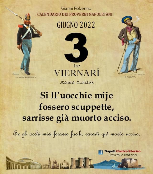 ‘O PRUVERBIO D’ ‘O JUORNO. Venerdì 3 giugno 2022 03/06/2022 binews.it ATTUALITA', EVIDENZA, Il Proverbio del Giorno 0 di Gianni Polverino Si ll’uocchie mije fossero scuppette, sarrisse già muorto acciso. Se gli occhi miei fossero fucili, saresti già morto ucciso.