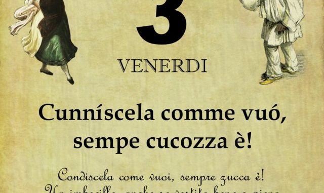 ‘O PRUVERBIO D’ ‘O JUORNO. Venerdì 3 maggio 2019 03/05/2019 binews.it ATTUALITA', EVIDENZA, Il Proverbio del Giorno 0 di Gianni Polverino Cunníscela comme vuó, sempe cucozza è! Condiscila come vuoi, sempre zucca è! Un imbecille, anche se vestito bene o pieno di soldi, resta e resterà sempre tale.