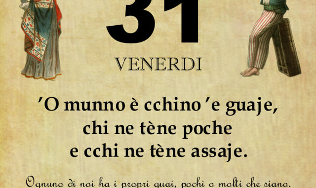 ‘O PRUVERBIO D’ ‘O JUORNO. Venerdì 31 luglio 2020 31/07/2020 binews.it ATTUALITA', EVIDENZA, Il Proverbio del Giorno 0 di Gianni Polverino ’O munno è cchino ’e guaje, chi ne tène poche e cchi ne tène assaje. Ognuno di noi ha i propri guai, pochi o molti che siano.