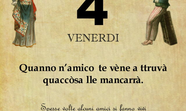 ‘O PRUVERBIO D’ ‘O JUORNO. Venerdì 4 settembre 2020 04/09/2020 binews.it ATTUALITA', EVIDENZA, Il Proverbio del Giorno 0 di Gianni Polverino Quanno n’amico te vène a ttruvà quaccòsa lle mancarrà. Spesse volte alcuni amici si fanno vivi solo per chiedere qualche favore.