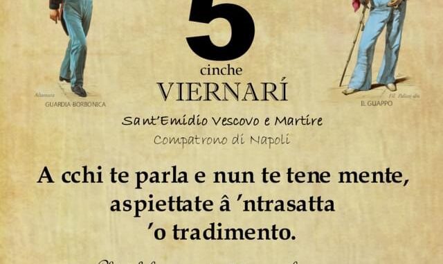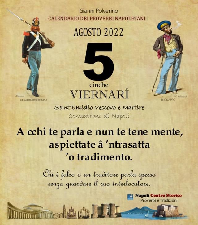 ‘O PRUVERBIO D’ ‘O JUORNO. Venerdì 5 agosto 2022 05/08/2022 binews.it ATTUALITA', EVIDENZA, Il Proverbio del Giorno 0 di Gianni Polverino A cchi te parla e nun te tene mente, aspiettate â ’ntrasatta ’o tradimento. Chi è falso o un traditore parla spesso senza guardare il suo interlocutore.