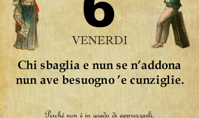 ‘O PRUVERBIO D’ ‘O JUORNO. Venerdì 6 novembre 2020 06/11/2020 binews.it ATTUALITA', EVIDENZA, Il Proverbio del Giorno 0 di Gianni Polverino Chi sbaglia e nun se n’addona nun ave besuogno ’e cunziglie. Perché non è in grado di apprezzarli.