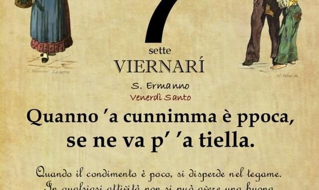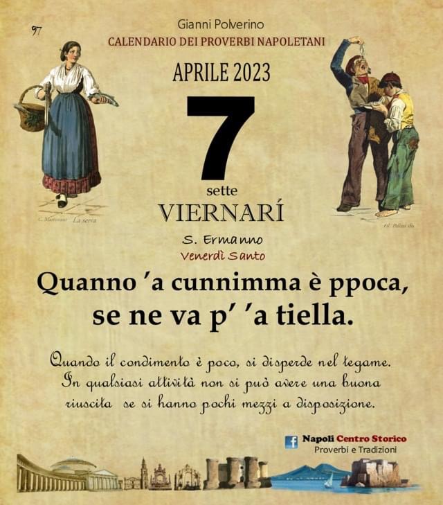 ‘O PRUVERBIO D’ ‘O JUORNO. Venerdì 7 aprile 2023 07/04/2023 binews.it ATTUALITA', EVIDENZA, Il Proverbio del Giorno 0 di Gianni Polverino Quanno ’a cunnimma è ppoca, se ne va p’ ’a tiella. Quando il condimento è poco, si disperde nel tegame. In qualsiasi attività non si può avere una buona riuscita se si hanno pochi mezzi a disposizione.