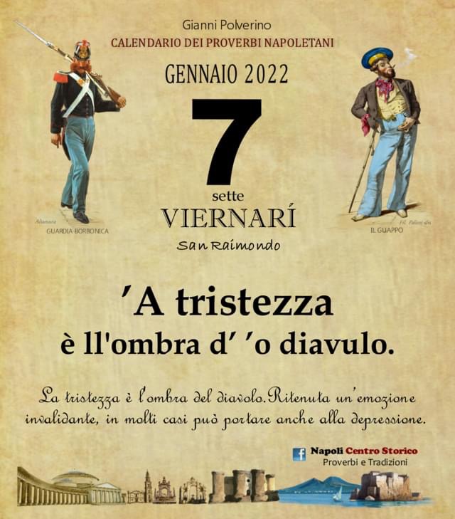 ‘O PRUVERBIO D’ ‘O JUORNO. Venerdì 7 gennaio 2021 07/01/2022 binews.it ATTUALITA', EVIDENZA, Il Proverbio del Giorno 0 di Gianni Polverino ’A tristezza è ll’ombra d’ ’o diavulo. La tristezza è l’ombra del diavolo. Ritenuta un’emozione invalidante, in molti casi può portare anche alla depressione.