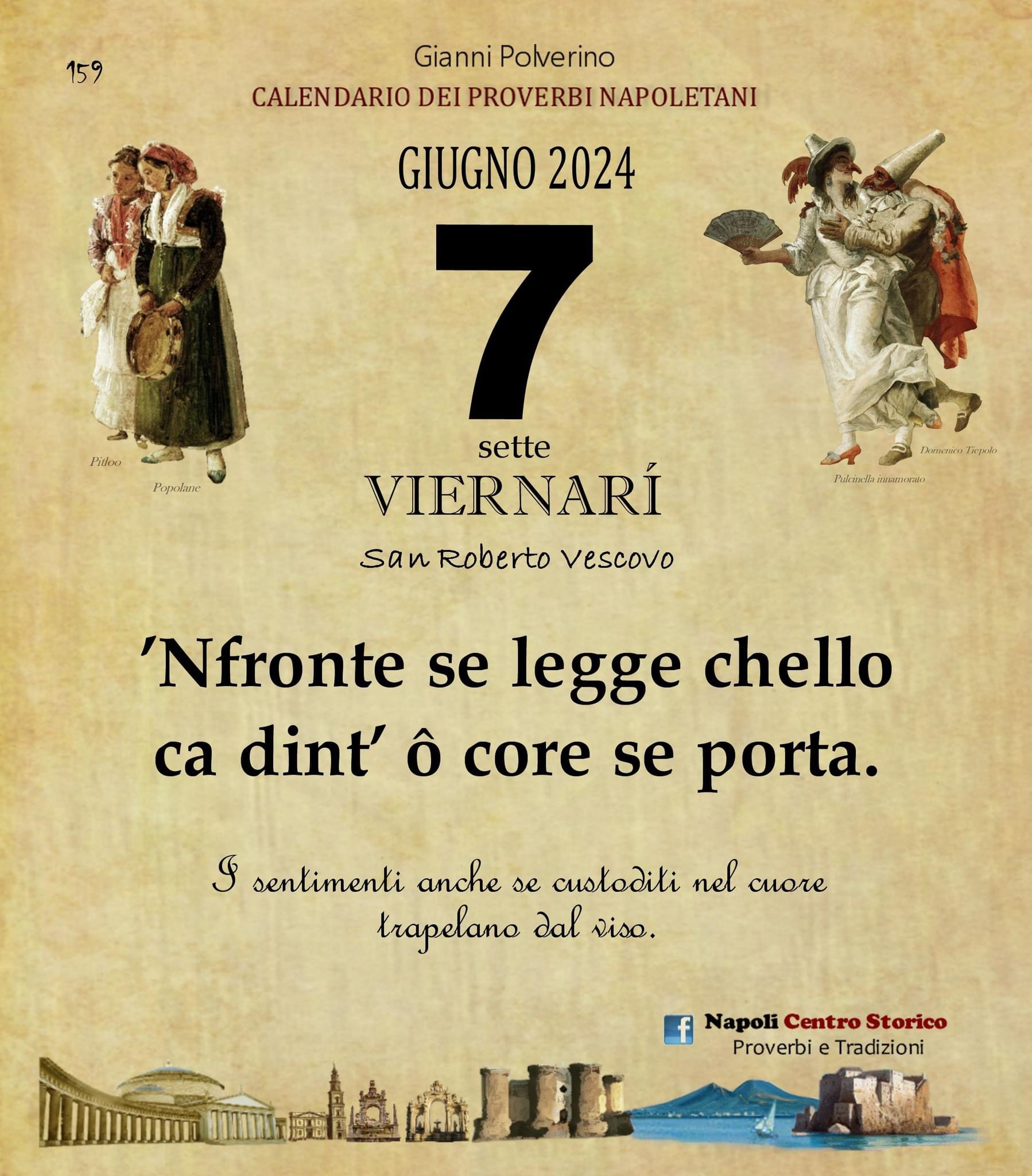 ‘O PRUVERBIO D’ ‘O JUORNO. Venerdì 7 giugno 2024 07/06/2024 binews.it ATTUALITA', EVIDENZA, Il Proverbio del Giorno 0 di Gianni Polverino ’Nfronte se legge chello ca dint’ ô core se porta. I sentimenti anche se custoditi nel cuore trapelano dal viso.