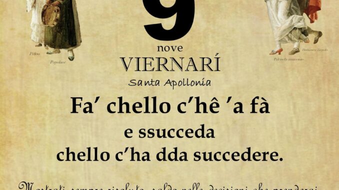 ‘O PRUVERBIO D’ ‘O JUORNO. Venerdì 9 dicembre 2024 09/02/2024 binews.it ATTUALITA', EVIDENZA, Il Proverbio del Giorno 0 di Gianni Polverino Fa’ chello c’hê ’a fa e ssucceda chello c’ha dda succedere. Mostrati sempre risoluto, saldo nelle decisioni che prenderai, senza alcun timore per le conseguenze.