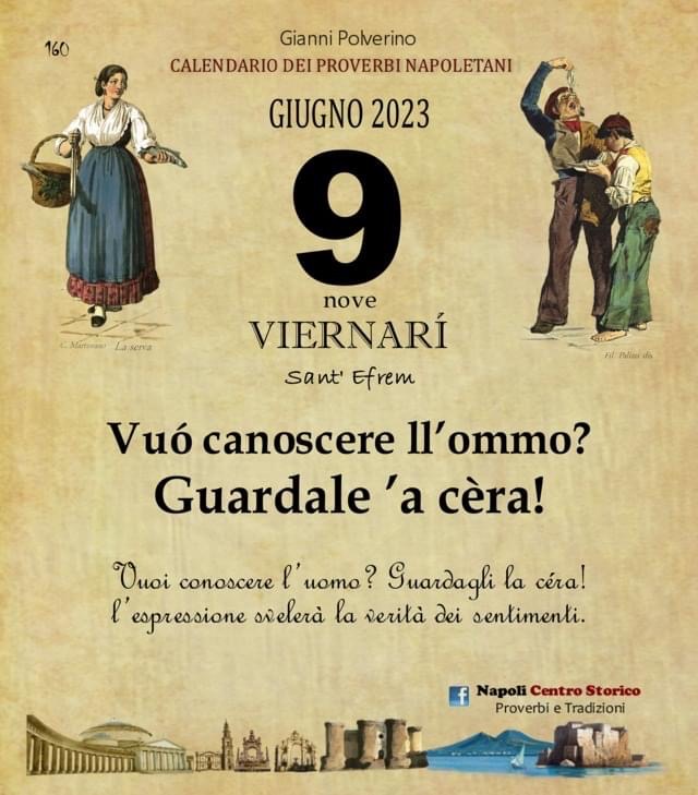 ‘O PRUVERBIO D’ ‘O JUORNO. Venerdì 9 giugno 2023 09/06/2023 binews.it ATTUALITA', EVIDENZA, Il Proverbio del Giorno 0 di Gianni Polverino Vuó canoscere ll’ommo? Guardale ’a cèra! Vuoi conoscere l’uomo? Guardagli la céra! L’espressione svelerà la verità dei sentimenti.