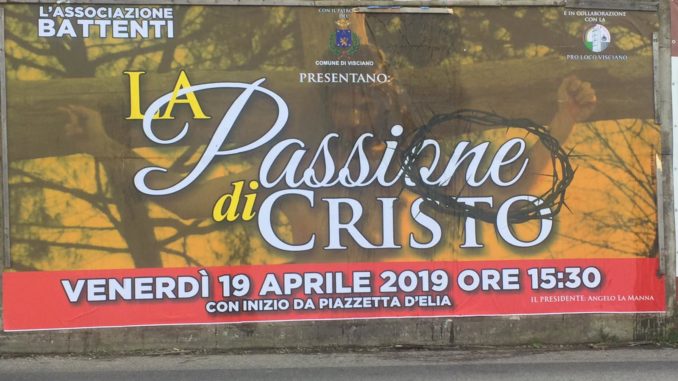 Oggi è il giorno della contemplazione, è il VENERDÌ SANTO in cui la Chiesa e il cristianesimo ricorda la Passione e Morte di Gesù crocifisso sul Golgota a Gerusalemme e lì sepolto dopo tre giorni Risorse e poi Asceso al Cielo. Per ricordare questo mistero anche qui a Visciano, la Cittadella della Carità, sarà rievocato dalle 15,30 la Passione di Cristo con scene elaborate in varie parti del paese con circa 300 attori e figuranti con ente organizzatore l’Associazione ‘BATTENTI’ Maria SS CONSOLATRICE del CARPINELLO per la regia di Luigi Santorelli che interpreta anche il Nazareno. Voce fuori capo e narratore Padre Domenico La Manna, Parroco e Rettore del Santuario. Le scene si terranno maggiormente in piazzetta D’Elia dove verrá rappresentata l’Ultima Cena e Lavanda dei piedi. Nella Casa Paterna di Padre Arturo, l’Orto degli Ulivi, il Getsemani e il bacio di Giuda Iscariota. In piazzetta Sacramento, ossia, nei pressi del Monumento dei Caduti, il Processo nella Casa di Caifa e in Piazza Lancellotti quello di Ponzio Pilato che lo condannò a Morte. Qui vedremo la scena della Flagellazione, l’Incoronazione di Spine e la liberazione di Barabba.