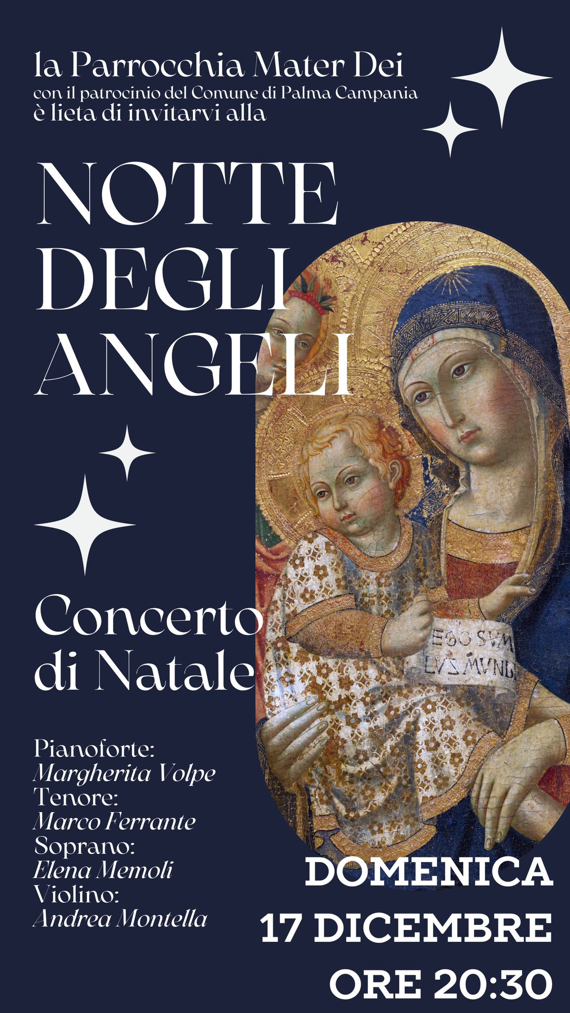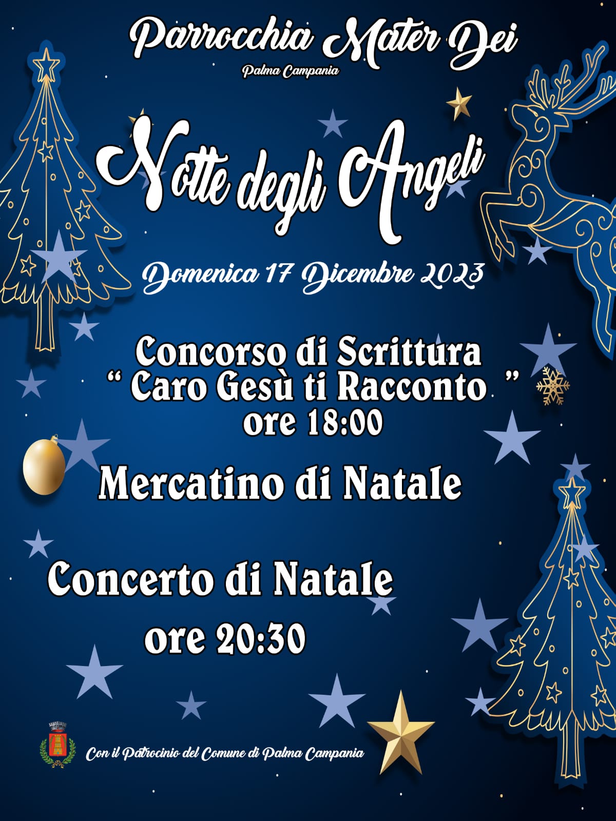 Domenica 17 dicembre, presso la parrocchia Mater Dei, si svolgerà la settimana edizione della manifestazione la “Notte degli Angeli”. L’ evento, fortemente voluto dal parroco don Tommaso Ferraro, è un momento di inclusione, di cultura e di divertimento. Si inizierà alle 18 con le premiazioni per il concorso “Caro Gesù ti racconto”; i bambini che risulteranno vincitori riceveranno un piccolo dono e saranno poi accompagnati da un elfo, in oratorio, lì ad attenderli ci sarà l’animazione. Si proseguirà con il mercatino di Natale che vedrà coinvolte alcune associazioni che esporranno dei prodotti: panettoni, calze natalizie, mostaccioli, calendari, prodotti da riciclo e tanto altro.