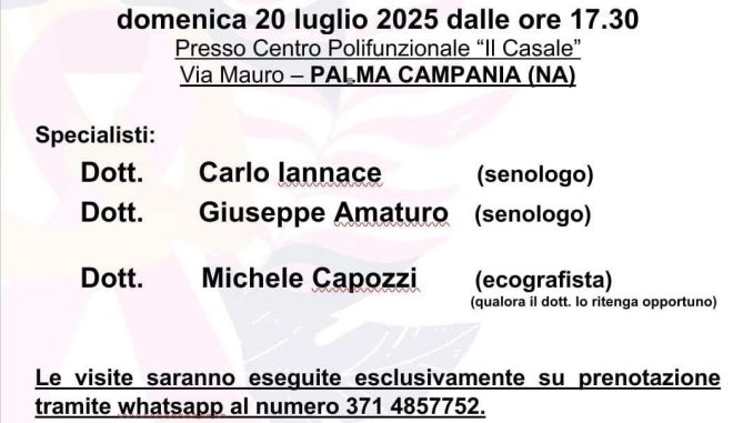 L’iniziativa, patrocinata moralmente dal Comune di Palma Campania, vedrà la presenza del Dott. Carlo Iannace, senologo di riferimento nel campo della prevenzione oncologica, affiancato dai colleghi Dott. Giuseppe Amaturo (senologo) e Dott. Michele Capozzi (ecografista – quest’ultimo interverrà qualora ritenuto necessario).