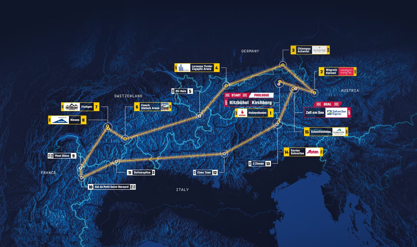I punti di svolta sono disseminati tra Austria, Germania, Svizzera, Francia e Italia. In alcuni casi i piloti dovranno atterrare per firmare una lavagna o scattare un selfie; in altri sorvoleranno le boe restando entro raggi tra i due e cinque km. Per quanto riguarda la penisola sono stati scelti il Colle del Piccolo San Bernardo, all’incirca sul confine con la Francia, il Rifugio Brentei sotto Cima Tosa nelle Dolomiti di Brenta, le Tre Cime di Lavaredo dove una via ferrata attende i partecipanti per raggiungere il Monte Paterno, alto 2740 mt, per poi atterrare a Sesto in Val Pusteria.