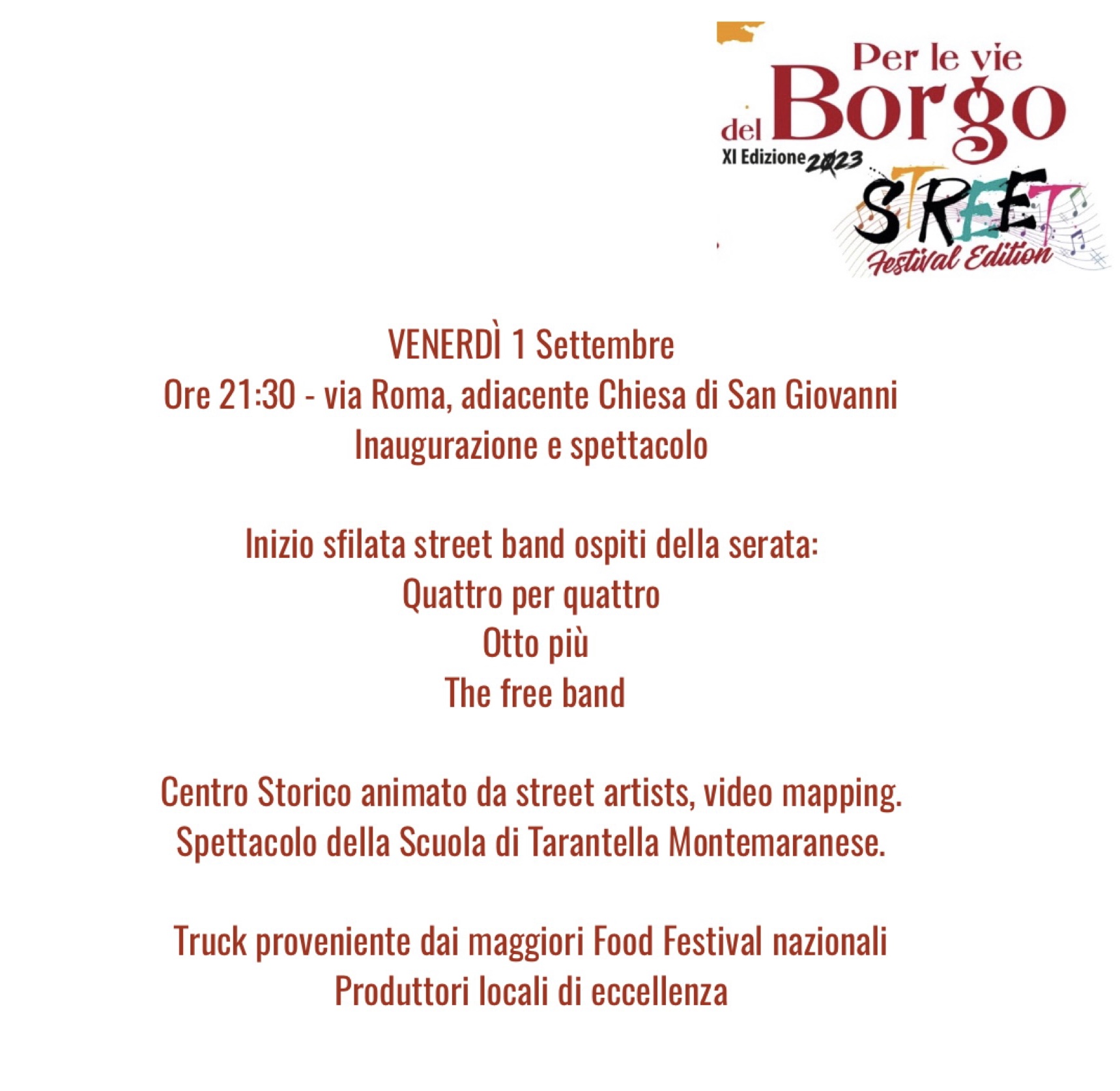 Si parte il 1 settembre alle ore 21:00 con l’apertura della manifestazione: una scenografia mozzafiato, nei pressi della Chiesa di San Giovanni, adiacente alla Piazza di San Giovanni, per aprire le strade ai visitatori.