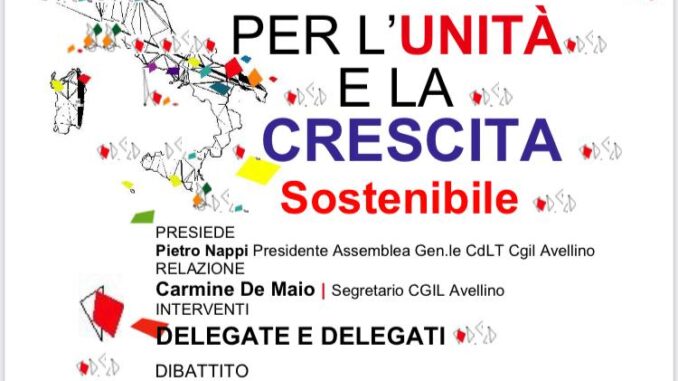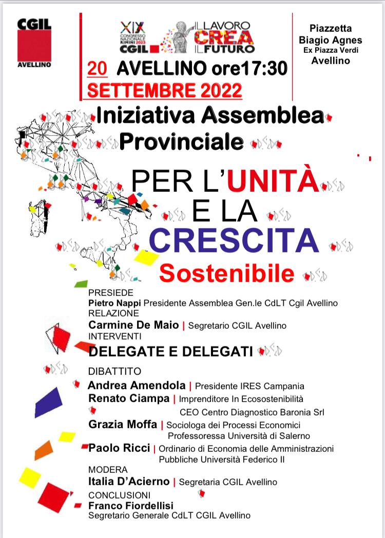 Martedì prossimo, 20 settembre, la Cgil Avellino terrà un’assemblea pubblica provinciale in Piazza Biagio Agnes ad Avellino: Per l’Unità e la Crescita sostenibile. Saranno presenti, Pietro Nappi, presidente assemblea generale Cgil Avellino, Carmine De Maio, segretario generale Filctem Cgil Avellino, Franco Fiordellisi, segretario generale Cgil Avellino che si confronteranno con Andrea Amendola, presidente Ires Campania, Renato Ciampa, Ceo Centro diagnostico Baronia Srl, Grazia Moffa, docente di Sociologia dei processi culturali, e Paolo Ricci, docente di Economia della Amministrazioni pubbliche. Modera: Italia D’Acierno, segretaria Cgil Avellino.