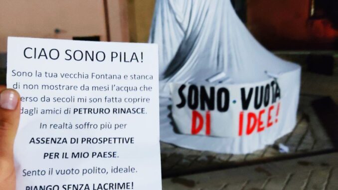 Gli attivisti di Petruro Rinasce hanno coperto la PILA, antica fontana medievale, a Petruro Irpino in segno di protesta verso la mancata cura della fontana stessa e del decoro urbano in generale con uno striscione con scritto: “SONO VUOTA DI IDEE”.
