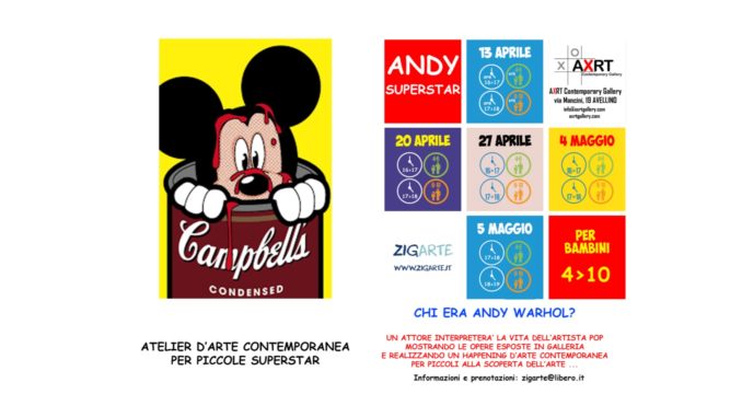 L’AXRT Contemporary Gallery, attualmente impegnata fino al 6 maggio 2019 con Fate Presto Pop Art, una mostra delle opere più rappresentative dell’artista statunitense Andy Warhol – curata da Stefano Forgione -, insieme all’associazione culturale ZIGARTE, chiamano “all’azione” bambini dai 4 ai 10 anni: al grido facciamo arte, apparirà un Andy Warhol ringiovanito che cercherà nuovi talenti per la sua factory. L’artista pop, interpretato dal giovane attore Michelangelo Belviso, si presenterà ai bambini raccontando la storia affascinante della sua vita, il significato “artistico/non artistico” delle sue opere, la sua concezione personale dell’arte; i bambini, che si sentono tutti superstar, saranno ben contenti di ascoltarlo soprattutto se alla fine del monologo e della visita guidata in galleria, c’è anche un happening artistico entusiasmante.
