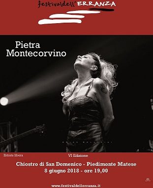 Sarà Pietra Montecorvino la protagonista dell’apertura primaverile della sesta edizione del Festival dell’Erranza. Venerdì 8 giugno alle ore 19:00 a Piedimonte Matese (CE), nel chiostro del complesso monumentale di San Tommaso d’Aquino (Largo San Domenico), lastraordinaria cantante e attrice sarà ospite d’onore dell’anteprima della rassegna ormai di rilievo nazionale e con ospiti di respiro internazionale.