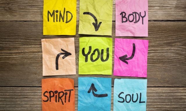 mind, body, spirit, soul and you - balance or wellbeing concept - handwriting on colorful sticky notes against grained wood