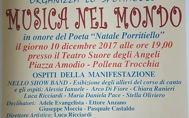 “Musica nel Mondo”. È questo il nome del nuovo spettacolo organizzato dall’Associazione musicale e culturale “Gaetano Donizetti”, che per domenica 10 dicembre ha messo in calendario un evento dedicato alla musica e alla poesia come sempre con ospiti di livello. Con il patrocinio del Comune di Pollena Trocchia, lo spettacolo ideato da Francesco Lombardi e Salvatore Varriale sarà ospitato a partire dalle ore 19:00 nel Teatro Suore degli Angeli di Piazza Amodio, in pieno centro di Pollena Trocchia, e sarà dedicato al poeta Natale Porritiello. Nel corso della manifestazione si esibirà la Nello Show Band, che da anni allieta il pubblico con i propri spettacoli, gli allievi del corso di canto dell’Associazione Donizetti, e gli ospiti canori Alessia Ianuale, Arco Di Fiore, Chiara Ranieri, Luca Ricciardi, Maria Daniela Pace e Stella Oliviero. Oltre che dalla musica la manifestazione, il cui direttore artistico è Luca Ricciardi, con Enzo Sorrentino tecnico audio e suono, sarà arricchita dalla declamazione di poesie con Adele Evangelista, Ettore Anzano, Giuseppe Moccia e Pasquale Castaldo. “Abbiamo voluto organizzare questo evento a chiusura di un altro intenso anno di attività che ha visto la nostra associazione protagonista sul territorio con eventi di qualità che hanno riscosso consensi e successo. Speriamo che valga lo stesso per l’appuntamento di domenica sera” hanno detto dall’Associazione Donizetti. “Dopo l’inaugurazione del Villaggio di Babbo Natale delle scorse ore, stiamo per vivere un altro importante evento sul nostro territorio, questa volta dedicato alla musica e alla poesia. Ringrazio, a nome di tutta la cittadinanza, l’Associazione Donizetti per l’impegno profuso in questa e nelle precedenti occasioni, impegno che serve a regalare a Pollena Trocchia gradevolissimi momenti di cultura e intrattenimento” ha detto il Sindaco del comune vesuviano, Francesco Pinto. “Sono particolarmente lieta che accanto alla parte musicale questa manifestazione preveda la declamazione di versi e poesie, così come mi allieta la dedica dell’evento al poeta Natale Porritiello, nativo della vicina Sant’Anastasia e autore di diversi libri di poesie, sia in italiano che in dialetto” ha aggiunto l’Assessore alla Cultura Margherita Romano.