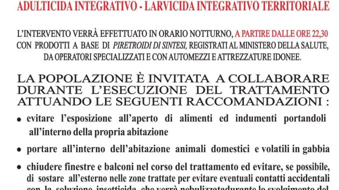 Il Comune di Pompei annuncia il secondo intervento di disinfestazione sul territorio, programmato per giovedì 28 agosto a partire dalle ore 22:30, nell’ambito del piano di prevenzione contro la proliferazione delle zanzare e la circolazione del Virus West Nile.