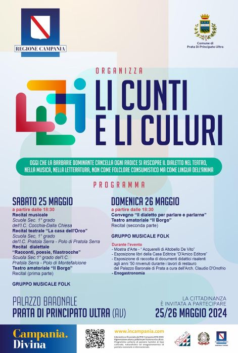 Nella splendida cornice del Palazzo Baronale di Prata di Principato Ultra arriva la rassegna “Li cunti e li culuri”, evento finanziato dagli ultimi POC Campania e che vedrà partecipi sabato 25 e domenica 26 Maggio l’istituto comprensivo “Cocchia – Dalla Chiesa” di Prata ed Avellino, quello di Pratola Serra e Montefalcione e l’associazione di teatro amatoriale “Il Borgo” che si esibiranno in dei recital musicali, teatrali e dialettali a partire dalle 18.30 di sabato.