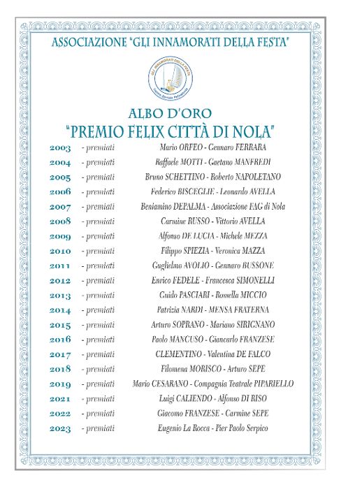 Nola – Il Premio Felix giunge alla sua 20 esima edizione. La manifestazione promossa dall’associazione “Gli Innamorati della Festa” con il patrocinio del Comune di Nola si svolgerà – così come da qualche anno – all’interno della suggestiva sala Vaccaro del Museo Storico Archeologico di Nola.