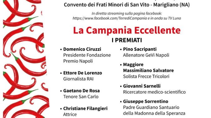 Dopo l’esperienza on-line del 2020, torna dal vivo, per l’VIII edizione, il Premio Terre di Campania, istituito dall’Associazione Terre di Campania quale riconoscimento alle personalità che, all’interno del nostro territorio regionale, si sono distinte in vari campi, dalla cultura, alla ricerca, all’arte fino allo sport. La cerimonia di premiazione, organizzata in collaborazione con Mattina Live, noto programma TV, e condotta da Mariù Adamo, si terrà venerdì 10 dicembre, a partire dalle ore 19:00, presso il Santuario della Madonna della Speranza, Convento dei Frati Minori di San Vito in Marigliano, location privilegiata per le ultime edizioni dell’evento. Il Premio Terre di Campania, nato dalla volontà di portare alla ribalta i valori umani e sociali che nutrono il saper fare e la voglia di coltivare il bello e il buono del nostro Territorio, si arricchisce quest’anno di una sezione speciale dedicata alla figura di Enrico Caruso, nel centenario della sua scomparsa. Non mancheranno, come da tradizione, premiati d’eccellenza rappresentanti il territorio di Marigliano, dove Terre di Campania da sempre opera. Il Premio Terre di Campania si presenta, dunque, come un momento di estremo valore sociale: punta i riflettori sulle eccellenze campane, quelle persone che, con il loro operato in diversi settori, hanno conferito lustro alla nostra regione e che, con la loro storia ed esperienza, sono un motivo di orgoglio per il territorio. Il riconoscimento è stato pensato, oltre che come gratificazione rivolta a coloro che si prodigano nel mettere in risalto il buono che caratterizza il nostro territorio, anche come sprone, stimolo a che proseguano la loro stimabile opera. L’edizione 2021 del Premio Terre di Campania vede i riconoscimenti assegnati a: Domenico Ciruzzi, Presidente Fondazione Premio Napoli; Ettore De Lorenzo, Giornalista RAI; Gaetano De Rosa, Tenore San Carlo; Christiane Filangieri, Attrice; Diego Lama, Scrittore; Chiara Ranieri, Cantante; Pino Sacripanti, Allenatore GeVi Napoli; Maggiore Massimiliano Salvatore, Solista Frecce Tricolori; Giovanni Sarnelli, Ricercatore medico-scientifico; Giuseppe Sorrentino, Padre Guardiano Santuario Madonna della Speranza; Luigi Vicinanza, Presidente Fondazione Cives-MAV Ercolano; TYA Marigliano, Squadra di pallavolo. Durante la serata saranno proclamati anche i vincitori del Concorso Letterario-Scientifico Leo500, con la nuova sezione speciale dedicata a Dante Alighieri, riservato alla partecipazione degli allievi delle Scuole Secondarie di Secondo grado. La cerimonia di premiazione sarà trasmessa in diretta streaming sulla pagina Facebookhttps://www.facebook.com/TerrediCampania e in onda su TV Luna. L’ingresso è riservato agli invitati solo con Green Pass rafforzato. Il progetto è finanziato con la L.R. n. 7/2003, contributi per la promozione culturale anno 2021 e beneficia del patrocinio del Comune di Marigliano e dell’Università degli Studi di Napoli Fedrico II. L’iniziativa è realizzata con la collaborazione dell’ISIS Manlio Rossi Doria di Marigliano, TermoClima Group, Disco Service Musicherai, Confetti Maxtris e Azienda Vitivinicola Salvatore Molettieri.