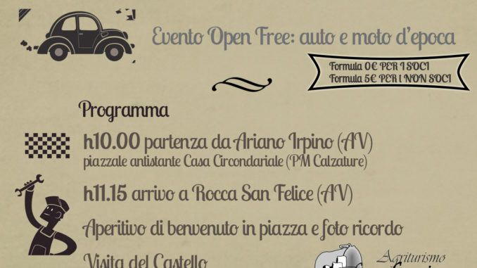 Dalle ore 10,00 raduno dei Cinquecentisti ad Ariano Irpino (AV) presso il piazzale antistante la casa circondariale ( Via Grignano n° 60). Iscrizione equipaggi gratuita per tutti i soci del Club, soli 5 € per i non soci. A seguire partenza in carovana alla volta di Rocca San Felice (AV). Aperitivo in piazza, foto ricordo e visita al Castello.