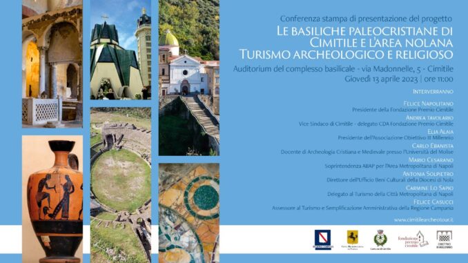 Giovedì 13 aprile, alle ore 11.00, presso la sala auditorium delle basiliche paleocristiane, in via Madonnelle 5 a Cimitile (Na), la Fondazione Premio Cimitile terrà una conferenza stampa per presentare il progetto “Le basiliche paleocristiane di Cimitile e l’area nolana. Turismo archeologico e religioso” e il Convegno internazionale di studi “Materiali, tecniche e sedi di lavoro fra tarda antichità e medioevo”, iniziative entrambe finalizzate alla valorizzazione e alla promozione dei beni archeologici e religiosi dell’agro nolano.