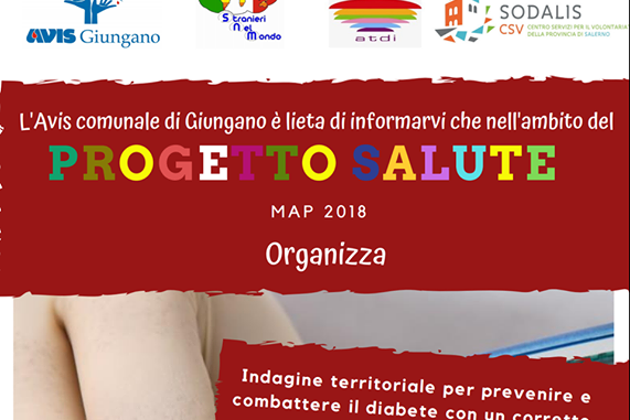 ’Avis Comunale di Giungano in collaborazione con L’Associazione Diabetologici Italiani A.T.D.I.– onlus e L’Associazione Multietnica “Stranieri nel Mondo” ripropone con il patrocinio di Sodalis CSV Salerno il “PROGETTO SALUTE” , progetto che ha vecchie radici in quanto già realizzato in passato dal Presidente dell’Avis Comunale Giungano Ennio Francia.