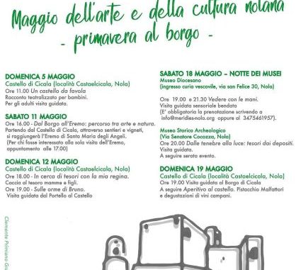 NOLA – Il sito è quello ameno e un po’ dimenticato di Cicala, l’occasione sono le belle giornate che ci porta il mese di maggio, i promotori l’associazione Meridies e la Pro Loco Nola Città d’Arte. Con un programma comune di iniziative per invitare a scoprire e vivere il borgo di Cicala, domenica 5 maggio prende il via “Maggio dell’Arte e della Cultura Nolana – Primavera al Borgo”, un calendario di appuntamenti pensato per grandi e piccini con visite guidate, passeggiate naturalistiche, spettacoli e giochi per i bambini. Proprio questi ultimi saranno i destinatari della manifestazione di apertura, in programma il 5 maggio alle ore 11, “Un Castello da Favola”, un racconto teatralizzato che vedrà la partecipazione della libreria Bibí e Cocò. Si continua con visite guidate ed escursioni lungo i sentieri di Cicala: sabato 11 alle 16 attraverso un percorso tra arte e natura i visitatori si muoveranno “dal Borgo all’Eremo”, giungendo dal Castello di Cicala all’Eremo di Santa Maria degli Angeli, dove alle 17 ci sarà una visita guidata alla scoperta dello straordinario complesso artistico. Domenica 12, invece, alle 18 mamme e bambini saranno i protagonisti con una caccia al tesoro nel castello, a cui seguirà alle 19 un’insolita visita guidata al borgo “Sulle Orme di Bruno”. Si chiude in allegria domenica 19 maggio alle 19 con un Aperitivo al Castello che vede la partecipazione dei Pistacchio Malfattori e dell’Associazione Italiana Sommelier. Il mese di maggio in arte e cultura, inoltre, non può mancare l’appuntamento con la Notte dei Musei, l’iniziativa promossa dal Ministero dei Beni Culturali e in programma sabato 18 maggio. Alle 19 e alle 21.30 ci saranno visite guidate sensoriali al Museo Diocesano, alle 20, invece, al Museo Storico Archeologico saranno esposti dai depositi tesori finora nascosti. “Torna il Maggio dell’arte e della cultura nolana” – spiega Michele Napolitano, presidente di Meridies – “Tornano gli appuntamenti culturali che consentono di promuovere il patrimonio artistico nolano. In particolare, la scelta di valorizzare per l’edizione 2019 il borgo di Cicala con attività diversificate, consentirà ai visitatori di godere di un importante tesoro fruibile solo in maniera sporadica”. “Non smettiamo di credere nelle risorse monumentali del nostro territorio” dice il presidente della Pro Loco Nola, Giuseppe Bianco “conosciute già o, per alcuni, non ancora, l’impegno della Pro Loco è di trasmettere l’importanza che esse rappresentano per la nostra storia quanto per il nostro futuro e quest’anno siamo lieti di farlo in intesa con Meridies”.