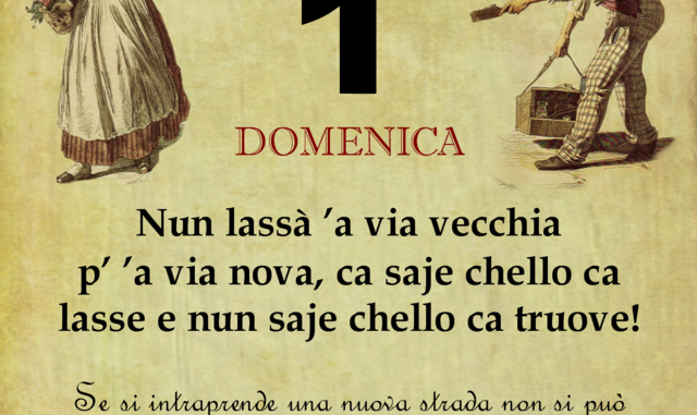 ‘O PRUVERBIO D’ ‘O JUORNO. Domenica 1 ottobre 2017 01/10/2017 binews.it ATTUALITA', Il Proverbio del Giorno 0 Nun lassà ’a via vecchia p’ ’a via nova, ca saje chello ca lasse e nun saje chello ca truove! Se si intraprende una nuova strada non si può sapere a che cosa si vada incontro.