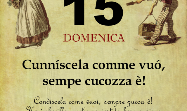‘O PRUVERBIO D’ ‘O JUORNO. Domenica 15 ottobre 2017 15/10/2017 binews.it ATTUALITA', Il Proverbio del Giorno 0 Cunníscela comme vuó, sempe cucozza è! Condiscela come vuoi, sempre zucca è! Un imbecille, anche se vestito bene o pieno di soldi, resta e resterà sempre tale.