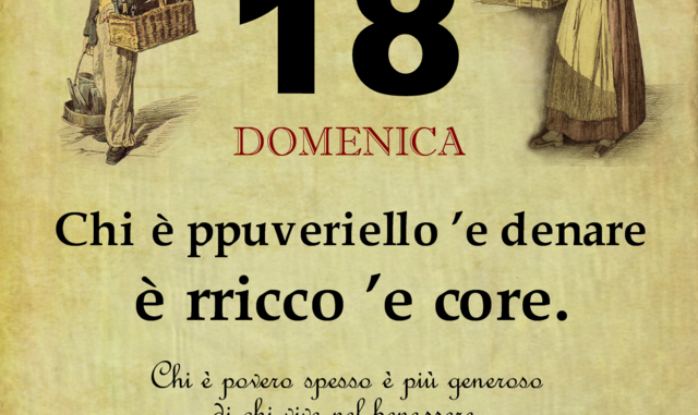 ‘O PRUVERBIO D’ ‘O JUORNO. Domenica 18 febbraio 2018 18/02/2018 binews.it ATTUALITA', EVIDENZA, Il Proverbio del Giorno 0 Chi è ppuveriello ’e denare è rricco ’e core. Chi è povero spesso è più generoso di chi vive nel benessere.