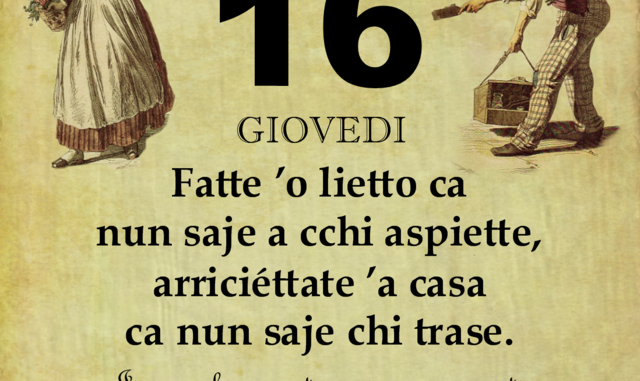 ‘O PRUVERBIO D’ ‘O JUORNO. Giovedì 16 novembre 2017 16/11/2017 binews.it ATTUALITA', Il Proverbio del Giorno 0 Fatte ’o lietto ca nun saje a cchi aspiette, arriciéttate ’a casa ca nun saje chi trase. In casa bisogna tenersi sempre pronti, anche a visite inaspettate.
