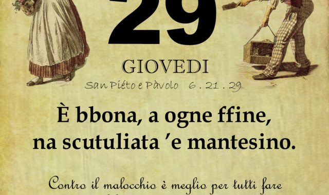‘O PRUVERBIO D’ ‘O JUORNO. Giovedì 29 giugno 2017 29/06/2017 binews.it ATTUALITA', Il Proverbio del Giorno 0 È bbona, a ogne ffine, na scutuliata ’e mantesino. Contro il malocchio è meglio per tutti fare qualche opportuno scongiuro.
