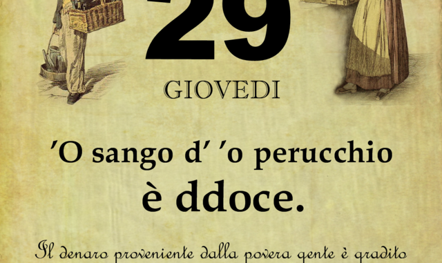 ‘O PRUVERBIO D’ ‘O JUORNO. Giovedì 29 marzo 2018 29/03/2018 binews.it ATTUALITA', Il Proverbio del Giorno 0 O sango d’ ’o perucchio è ddoce. Il denaro proveniente dalla povera gente è gradito allo strozzino, ai potenti e ai politicanti.