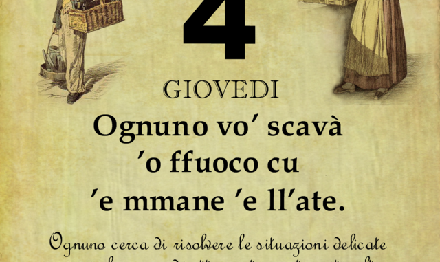 ‘O PRUVERBIO D’ ‘O JUORNO. Giovedì 4 gennaio 2018 04/01/2018 binews.it ATTUALITA', Il Proverbio del Giorno 0 Ognuno vo’ scavà ’o ffuoco cu ’e mmane ’e ll’ate. Ognuno cerca di risolvere le situazioni delicate o pericolose non direttamente ma tramite altri per non esporsi in prima persona.