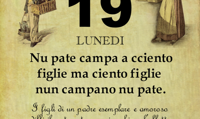 ‘O PRUVERBIO D’ ‘O JUORNO. Lunedì 19 marzo 2018 19/03/2018 binews.it ATTUALITA', Il Proverbio del Giorno 0 Nu pate campa a cciento figlie ma ciento figlie nun campano nu pate. I figli di un padre esemplare e amoroso difficilmente potranno ricambiare l’affetto e i suoi sacrifici.