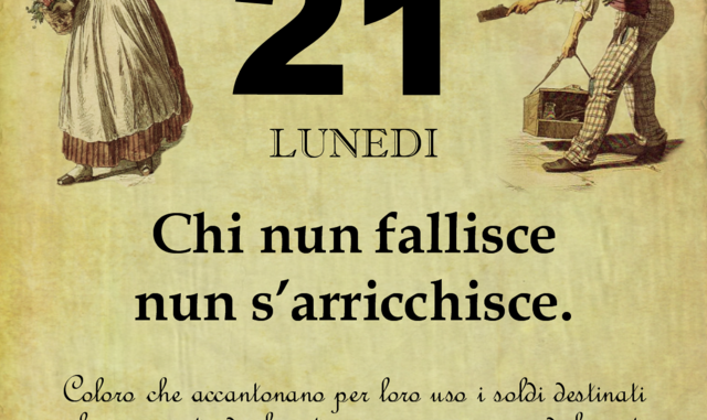 ‘O PRUVERBIO D’ ‘O JUORNO. Lunedì 21 agosto 2017 21/08/2017 binews.it ATTUALITA', Il Proverbio del Giorno 0 Chi nun fallisce nun s’arricchisce. Coloro che accantonano per loro uso i soldi destinati al pagamento dei fornitori, pur se vengono dichiarati falliti, avranno per contro un bel gruzzolo.