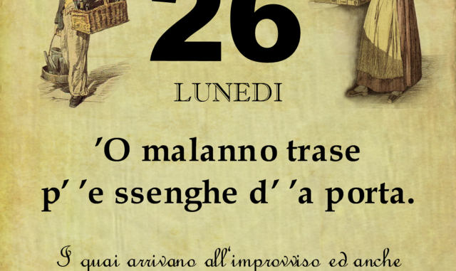 ‘O PRUVERBIO D’ ‘O JUORNO. Lunedì 26 febbraio 2018 26/02/2018 binews.it ATTUALITA', EVIDENZA, Il Proverbio del Giorno 0 O malanno trase p’ ’e ssenghe d’ ’a porta. I guai arrivano all‘improvviso ed anche se si fa di tutto per evitarli.