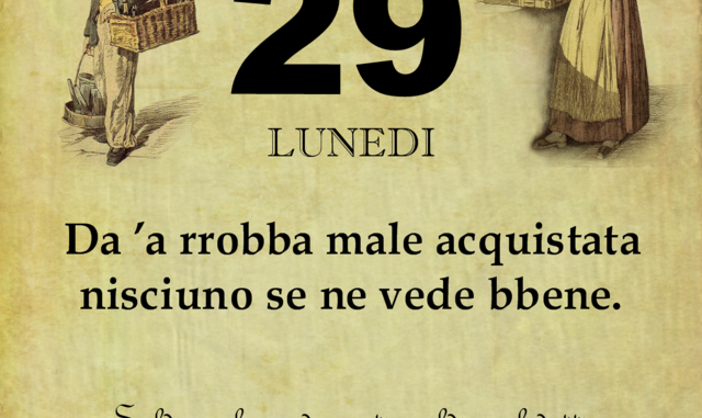 ‘O PRUVERBIO D’ ‘O JUORNO. Lunedì 29 gennaio 2018 29/01/2018 binews.it ATTUALITA', Il Proverbio del Giorno 0 Da ’a rrobba male acquistata nisciuno se ne vede bbene. Soldi mal guadagnati, soldi maledetti.