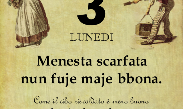 ‘O PRUVERBIO D’ ‘O JUORNO. Lunedì 3 luglio 2017 03/07/2017 binews.it ATTUALITA', EVIDENZA, Il Proverbio del Giorno 0 Menesta scarfata nun fuje maje bbona. Come il cibo riscaldato è meno buono così è da evitare di riprendere un amore spezzato o un amicizia raffreddata.