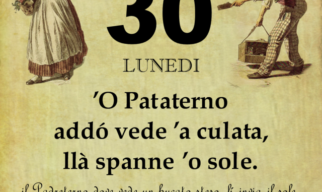 ‘O PRUVERBIO D’ ‘O JUORNO. Lunedì 30 ottobre 2017 30/10/2017 binews.it ATTUALITA', Il Proverbio del Giorno 0 O Pataterno addó vede ’a culata, llà spanne ’o sole. Il Padreterno dove vede un bucato steso, lí invia il sole. La provvidenza è sempre presente dove occorre.